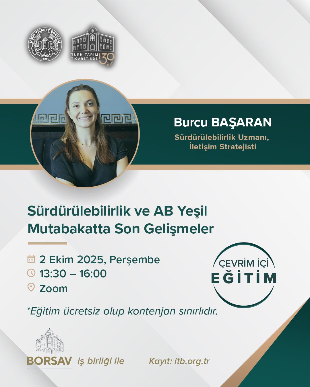 2 Ekim 2025 tarihinde Borsamız organizasyonunda ve İzmir Ticaret Borsası Eğitim, Kültür ve Sosyal Entegrasyon Vakfı (BORSAV) iş birliğinde Burcu Başaran tarafından 13:30 - 16:00 saatleri arasında “Sürdürülebilirlik ve AB Yeşil Mutabakatta Son Gelişmeler” Eğitimi çevirimiçi olarak Zoom platformu üzerinden gerçekleşecektir.