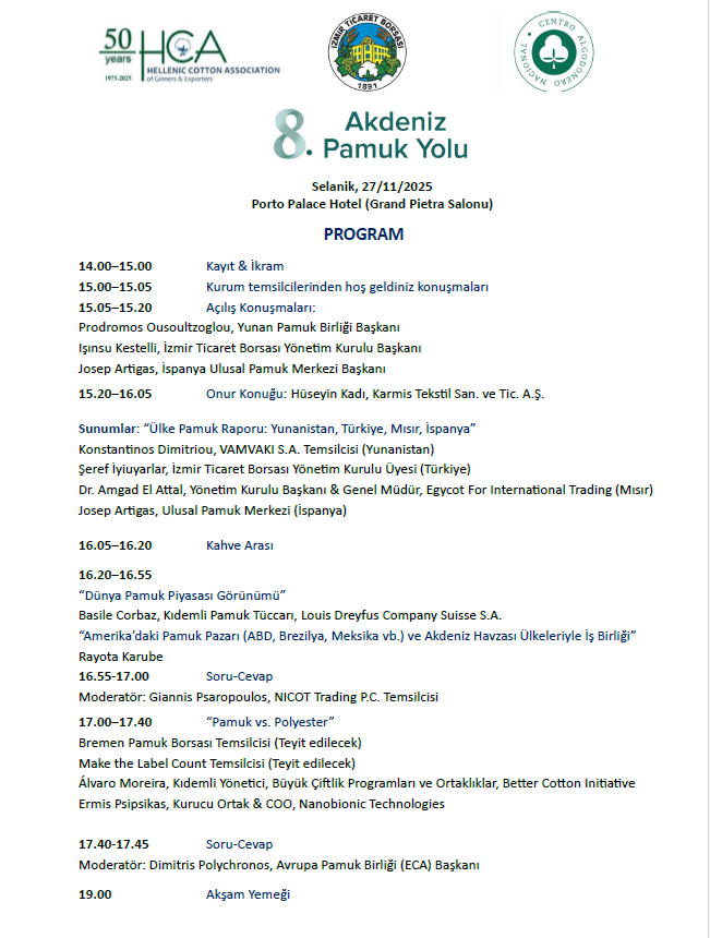 2016 yılından bu yana Akdeniz pamuk ülkelerini bir araya getiren, pamuk ve tekstil sektöründeki son gelişmelerin paylaşıldığı Akdeniz Pamuk Yolu Etkinliğinin sekizincisi 27 Kasım 2025 tarihinde İzmir Ticaret Borsası, Yunan Pamuk Birliği ve İspanya Ulusal Pamuk Merkezi işbirliğiyle Yunanistan'ın Selanik kentinde gerçekleştirilecektir.