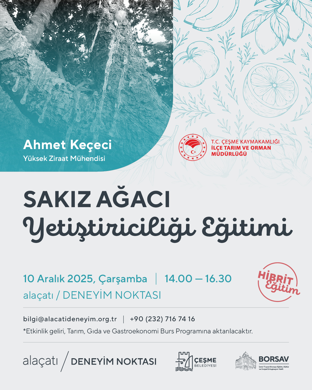 İzmir Ticaret Borsası Eğitim, Kültür ve Sosyal Entegrasyon Vakfı - BORSAV tarafından 10 Aralık 2025, Çarşamba günü hibrit (fiziki katılım ve online katılım seçeneğiyle) olarak Sakız Ağacı Yetiştiriciliği Eğitimi gerçekleştirilecektir.