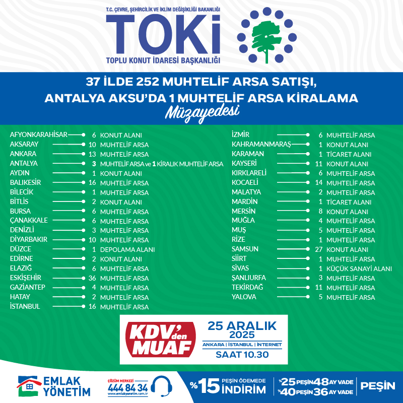 Emlak Yönetim Hizmetleri ve Ticaret A.Ş.'den alınan yazıda 25 Aralık 2025 tarihinde TOKİ'nin 37 ilde 252 muhtelif arsa satışa sunacağı ve Antalya'da 1 adet muhtelif arsa kiralacağı belirtilmiştir.