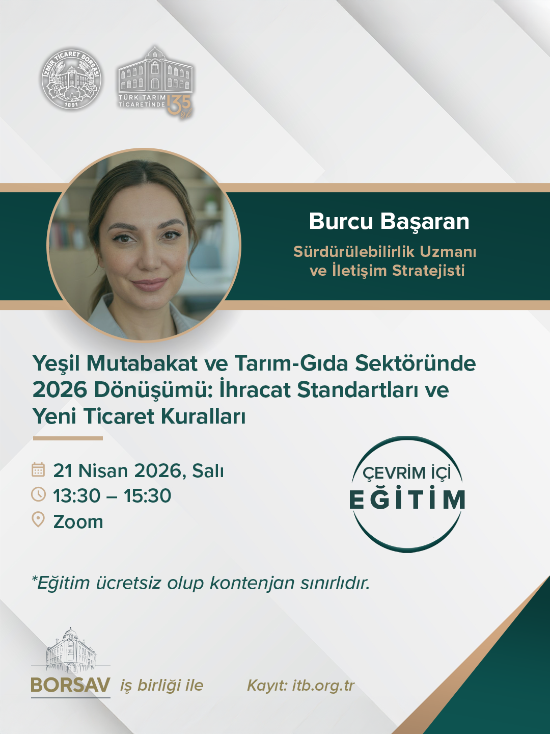 21 Nisan 2026 tarihinde Borsamız organizasyonunda ve İzmir Ticaret Borsası Eğitim, Kültür ve Sosyal Entegrasyon Vakfı (BORSAV) iş birliğinde Burcu Başaran eğitmenliğinde 13:30 – 15:30 saatleri arasında çevirim içi olarak (ZOOM) “Yeşil Mutabakat ve Tarım-Gıda Sektöründe 2026 Dönüşümü: İhracat Standartları ve Yeni Ticaret Kuralları” eğitimi gerçekleşecektir.
