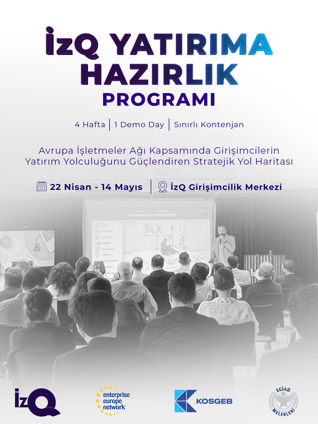 İzQ Yatırıma Hazırlık Programı; Avrupa İşletmeler Ağı kapsamında, KOSGEB İzmir Müdürlüğü, İzQ ve EGİAD Melekleri iş birliğiyle hayata geçirilen, ürününü geliştirmiş ve ilk satışlarını gerçekleştirmiş teknoloji girişimlerini melek yatırımcılar ve risk sermayesi fonlarıyla buluşturmak için tasarlanmış, 4 haftalık yoğun bir programdır.