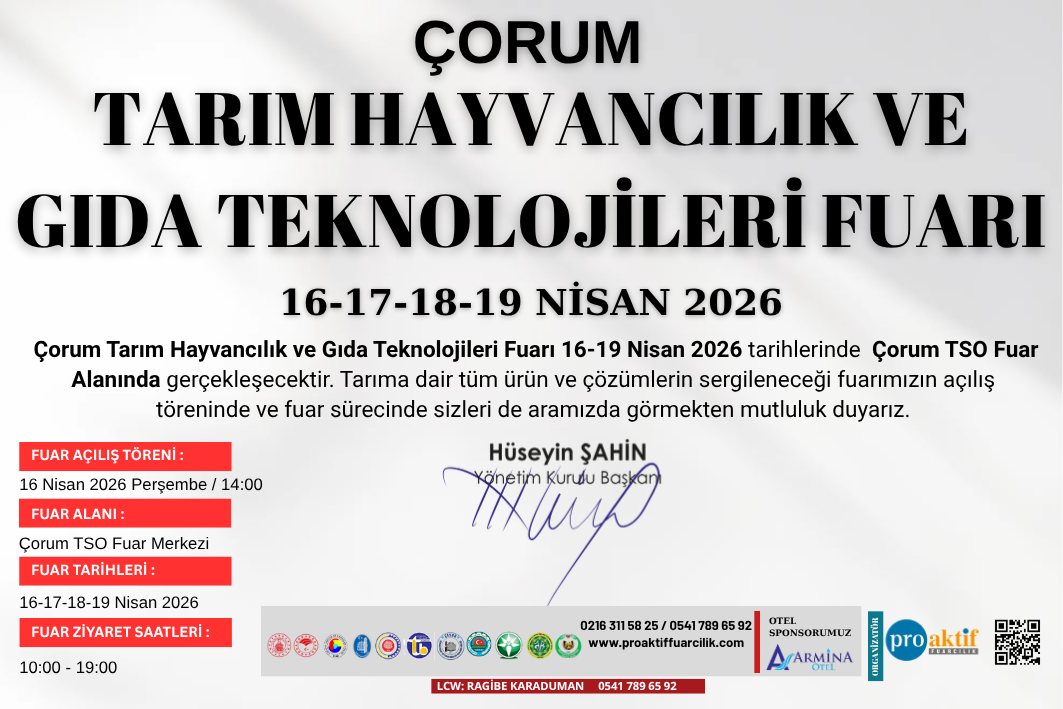Çorum Tarım, Hayvancılık, Gıda ve Teknolojileri Fuarı, 16-19 Nisan 2026 tarihleri arasında Çorum TSO Fuar Alanı’nda gerçekleştirilecektir.