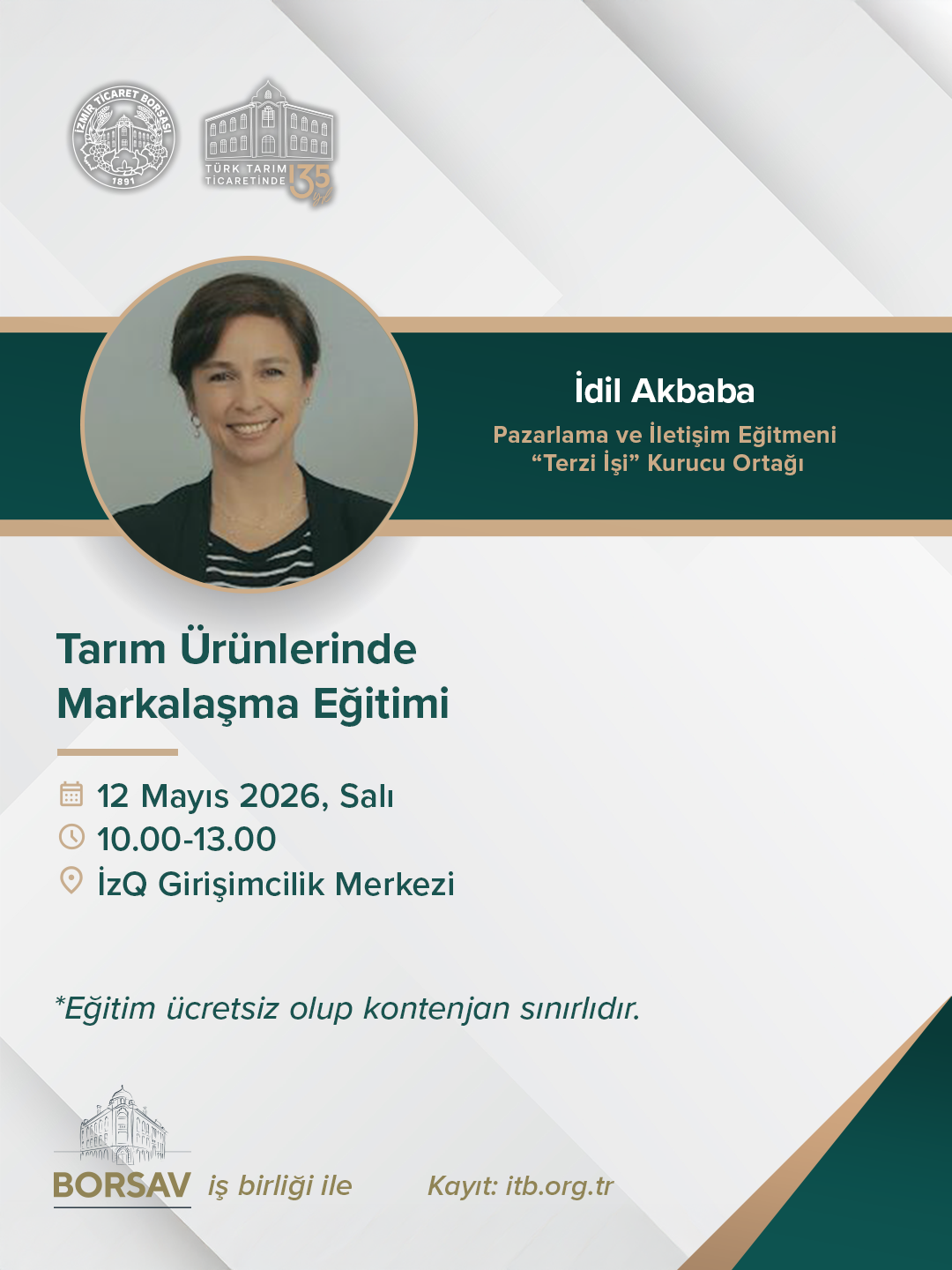 12 Mayıs 2026 tarihinde Borsamız organizasyonunda ve İzmir Ticaret Borsası Eğitim, Kültür ve Sosyal Entegrasyon Vakfı (BORSAV) iş birliğinde İdil Akbaba eğitmenliğinde 10:00 – 13:00 saatleri arasında İzQ Girişimcilik Merkezi'nde “Tarım Ürünlerinde Markalaşma Eğitimi” gerçekleşecektir.