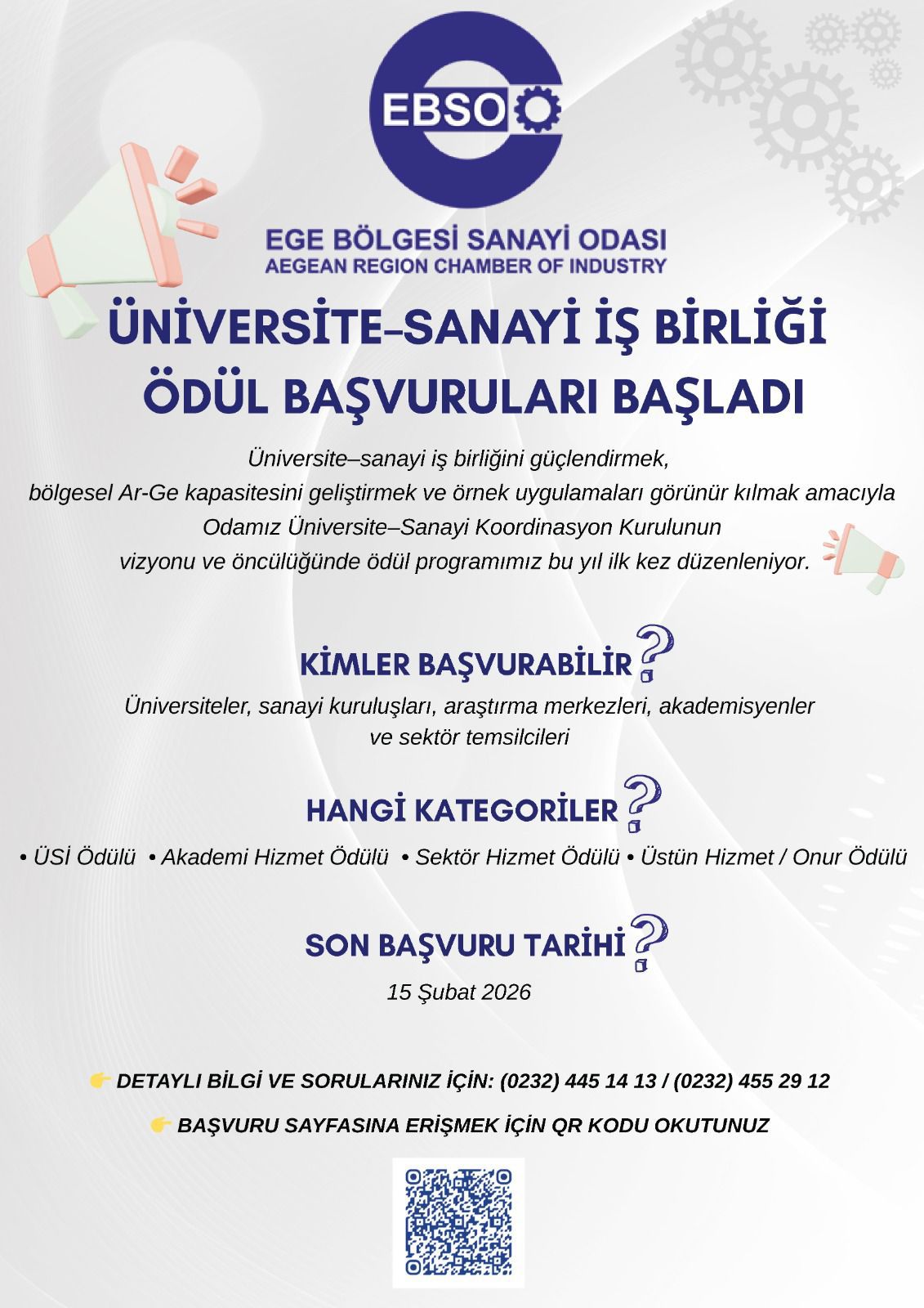 Ege Bölgesi Sanayi Odası'ndan alınan yazıda (EBSO); Üniversite - Sanayi İş Birliği Koordinasyon Kurulu Ödül Başvuru detayları iletilmektedir.
