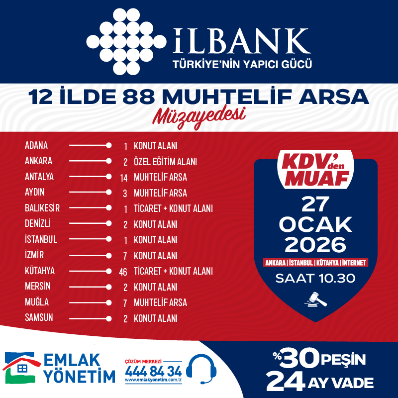 Emlak Müzayede'den alınan yazıda; 27 Ocak 2026 tarihinde 12 ilde 88 muhtelif arsanın satışa sunulacağı iletilmektedir.