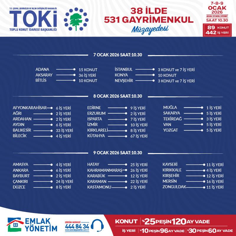 Emlak Müzayede'den alınan yazıda; TOKİ İstanbul Hizmet Binası Konferans Salonu Halkalı/İstanbul ve internet bağlantıları ile 07.01.2026 Çarşamba günü saat 10:30’da (1-171 Lotlar arası), 08.01.2026 Perşembe günü saat 10:30’da (172-346 Lotlar arası), 09.01.2026 Cuma günü saat 10:30’da (347-531 Lotlar arası) olacak şekilde yapılacağı bildirilmektedir.