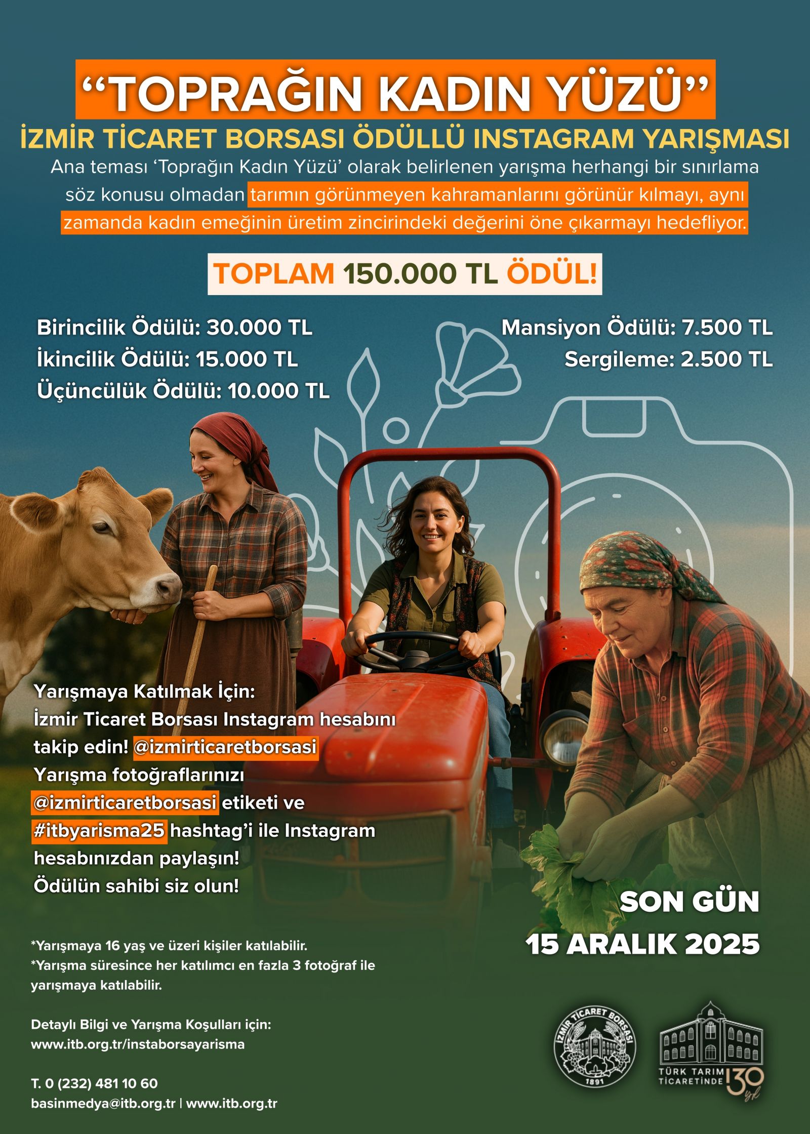 İzmir Ticaret Borsası’nın @izmirticaretborsasi adresli Instagram hesabı üzerinden, 1 Ekim-15 Aralık 2025 tarihleri arasında, “Toprağın Kadın Yüzü” teması ile tek kategoride düzenlenen yarışmasına katılacak fotoğrafların içeriği, herhangi bir sınırlama söz konusu olmadan kadın emeğinin üretim zincirindeki değerini öne çıkarmayı hedefliyor. Ayrıca, kadınların tarım alanındaki alın teri, emeği, üretim koşulları ve kırsal yaşamın gerçek yüzünü anlatan tüm kareler yarışma içeriğine dahil edildi. Tek başlık altında düzenlenecek yarışmanın sergilemelerle birlikte toplam ödül miktarı ise 150 bin Türk Lirası olarak belirlendi.